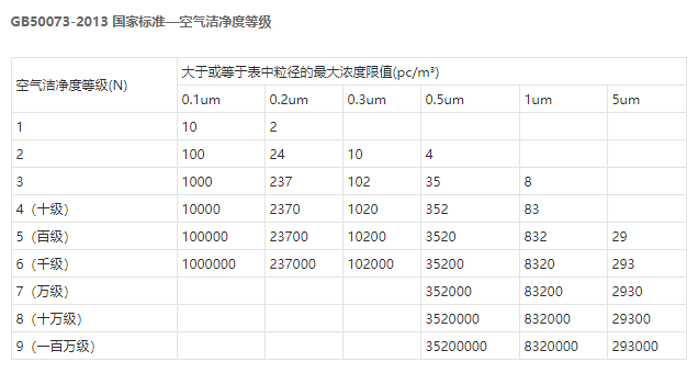 空氣潔凈度等級(jí)(air cleanliness class):潔凈空間單位體積空氣中,以大于或等于被考慮粒徑的粒子最大濃度限值進(jìn)行劃分的等級(jí)標(biāo)準(zhǔn)。國(guó)內(nèi)按空態(tài)、靜態(tài)、動(dòng)態(tài)對(duì)無(wú)塵車(chē)間進(jìn)行測(cè)試、驗(yàn)收,符合《GB50073-2013 潔凈廠房設(shè)計(jì)規(guī)范》、《GB50591-2010 潔凈室施工及驗(yàn)收規(guī)范》。